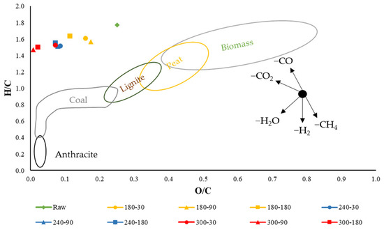 HC derived at 300 °C in 180 min, reaching the lowest value of 56% (