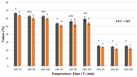 MY was observed from 64.73% to 73.57% for 180 °C, 30 min, and 300 °C, 180 min, respectively (