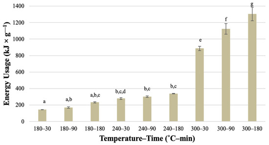 Statistically significant differences were mainly noted for energy usage by processes conducted at 300 °C (