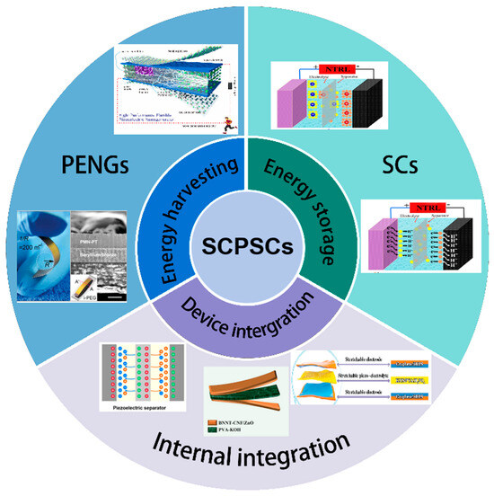 Piezoelectric ceramics exhibit exceptional mechanical strength, hardness, chemical inertness, and resistance to moisture. Conversely, piezoelectric polymers, like PVDF [6,113] and P(VDF-TrFE) (Poly(vinylidene fluoride-co-trifluoroethylene)), offer distinctive advantages, such as excellent stretchability and biocompatibility. Consequently, they find extensive use in flexible SCPSCs.