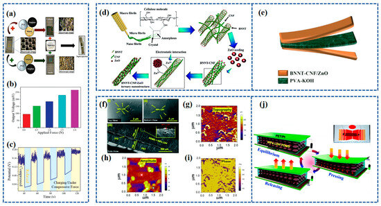 (a) Fabrication of SCAPSC; (b) variation in output voltage for applied force of different magnitudes; (c) cycling performance under compressive force. Reproduced from ref. [83], with permission. Copyright 2022, Wiley; (d) schematic illustration of the synthesis mechanism for the BNNT–CNF/ZnO ternary nanostructure; (e) schematic illustration of the solid-state flexible device. Reproduced from ref. [116], with permission. Copyright 2022, Royal Society of Chemistry. (f) FE-SEM of NiFe LDH:PDMS piezoelectric composite films in (i) top-view, (ii) top-view, and (iii) side-view [117]; (g) topography of NiFe LDH in a 2 mm scanning region using PFM [117]; (h) amplitude map of NiFe LDH in a 2 mm scan region using PFM [117]; (i) phase diagram of NiFe LDH in a 2 mm scanning region using PFM [117]; (j) schematic of the working of the NiFe LDH nanogenerator and (inset) real image of the NiFe LDH device. Reproduced from ref. [117], with permission. Copyright 2022, Royal Society of Chemistry.
