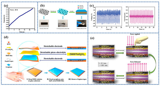 Zhou et al. [99] prepared a piezoelectric electrolyte by synthesizing potassium sodium niobate (KNN) mixed with PVA and H3PO4, referred to as KNN/PVA/H3PO4. Figure 6c illustrates the output voltage and current of the PENG based on the KNN/PVA/H3PO4 piezoelectric electrolyte operating at a frequency of 1 Hz. By placing the KNN/PVA/H3PO4-based piezoelectric electrolyte between graphene-coated elastomeric styrene–butadiene–styrene–benzene electrodes, a highly stretchable and Self-chargeable Supercapacitor (SCSC) device was prepared (Figure 6d). The highly stretchable device, once fabricated, can be charged to around 1.0 V through either pure hand tapping for 300 s at a frequency of 2 Hz or by repeated stretching for 40 s at 1 Hz.