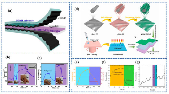 Lu et al. [128] established a flexible Piezoelectric Self-charging Supercapacitor (PSCS) using a PDMS-Reduced Graphene Oxide (rGO))/C hybrid membrane as positive and negative symmetric electrodes, PVA/H3PO4 as a gel electrolyte, and a reticular P(VDF-TrFE) membrane as a piezoelectric separator (Figure 9a). The porous structure of reticulated P(VDF-TrFE) films fabricated by the electrospinning process is suitable for ion migration. When the finger is bent to 90°, the device is charged to 0.45 V in 17 s and discharged in 18.0 s with a stable charging current of 6.4 μA (Figure 9b,c).