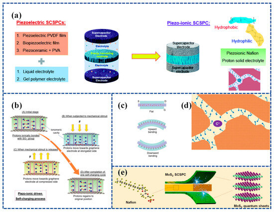 (a) The current architecture of SCSPC utilizing piezoelectric separators and the design of the novel piezo-ionic SCSPC in this work. The top and bottom of the right corner in Figure 10a show the molecular structure of Nafion and the ionomeric cavity present in Nafion; (b) mechanism of self-charging occurred in the Graphene PI-SCSPC; (c) proton movement in the Nafion film present in Graphene PI-SCSPC under the flat state, upward, and downward bending conditions. Reproduced from ref. [131], with permission. Copyright 2022, Royal Society of Chemistry; (d) schematic representation of the ionomeric channels present in Nafion for the free movement of cations (C+); (e) schematic representation of the fabrication of Nafion-based solid-state SCSPC using MoS2-QSs as supercapacitor electrodes. Reproduced from ref. [132], with permission. Copyright 2022, Elsevier.