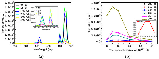 Changes in the concentration of rare-earth ions, the structure of the crystals, and their morphology usually lead to changes in the optical properties. Figure 4a shows the PL pattern of NYTYG nanorods with different Gd3+ concentrations under excitation by a 600 mW laser at a wavelength of 980 nm. It can be seen from the figure that under the excitation of the 980 nm laser, there are three ultraviolet luminescence peaks of 290 nm, 345 nm, and 360 nm, and two blue luminescence peaks of 450 nm and 475 nm, corresponding to the 1I6 → 3H6 (290 nm), 1I6 → 3F4 (345 nm), 1D2 → 3H6 (360 nm), 1D2 → 3F4 (450 nm), and 1G4 → 3H6 (475 nm) processes of the Tm3+ ion, respectively. In addition, when doped with Gd3+, a new UV luminescence peak appears at 310 nm, corresponding to the UC process of 6P7/2 → 8S7/2 of Gd3+ ions. To better understand the relationship between the up-conversion optical properties of NYTYG nanorods and the doping concentration of Gd3+ ions, we plotted the relationship between the luminescence intensity of NYTYG nanorods at different wavelengths and the concentration of Gd3+ ions. As shown in Figure 4b, when the concentration of Gd3+ is 5%, the five luminescence peaks of Tm3+ reach the highest, which is due to the doped Gd3+ ion making the crystal phase purer and the crystallinity higher, so the luminescence performance is better. However, as the Gd3+ concentration continued to increase, the fluorescence intensity of the five luminescence peaks of Tm3+ gradually decreased, whereas the luminescence peak at 310 nm of the 6P7/2 → 8S7/2 upconversion process of Gd3+ continued to increase with the increase in Gd3+ concentration and began to decrease when the Gd3+ ion concentration exceeded 30%.