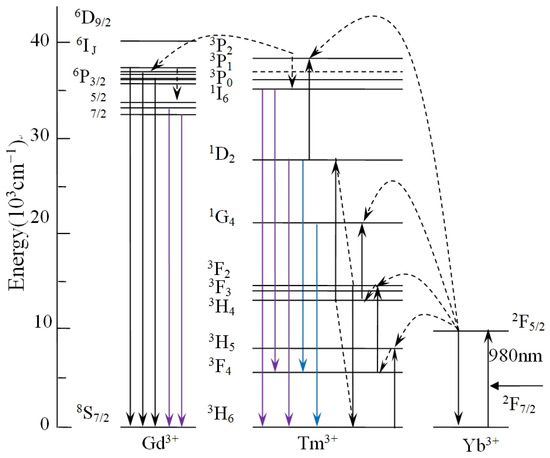 Figure 5 describes schematically possible UC populating for NYTYG NCs at the excitation wavelength of 980 nm. In the Yb3+, Tm3+, and Gd3+ tri-doped system, as analyzed in Ref. [51], Yb3+ absorbs 980 nm near-infrared light as a sensitizer and is distributed to the 3H5, 3F2, 3, and 1G4 energy levels of Tm3+ by continuous energy transfer. The 1D2 energy level is populated by the cross-relaxation process of 3F3 + 3H4 → 3H6 + 1D2. It is then populated from 1D2 to 3P2 by another energy transfer process and then rapidly relaxes to the 1I6 energy level. The fluorescence at 310 nm is closely related to the doping concentration of Gd3+ ions. As shown in Figure 5, for Gd3+ ions, the luminescence process at 310 nm corresponds to its 6P7/2 → 8S7/2 UC process, energy cannot be directly absorbed from 980 nm photons due to the large distance between 6P7/2 and the ground state, its energy comes from an energy transfer process (3P2 → 3H6(Tm3+): 8S7/2 → 6IJ(Gd3+)) followed by relaxation from the 6IJ energy level to the 6P7/2 energy level. In other words, Tm3+ acts as a sensitizer for Gd3+. Therefore, as the Gd3+ concentration increases, the peak intensity at 310 nm shows an upward trend, and at the same time the Tm3+ ion loses some of its energy due to energy transfer, resulting in a decrease in fluorescence intensity related to the Tm3+ energy level.
