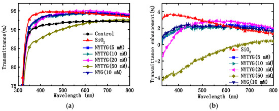 Based on the transmittance values in Figure 7a, the percentage increase in transmittance (ΔT/Tref) of glass samples coated with different films was further calculated using blank samples as a reference, as shown in Figure 7b. It can be seen from the figure that as the doping concentration of the nanorods increases, the peak position of ∆T/Tref also varies. The highest peak position of pure SiO2 samples was 363 nm, and when NYTYG concentrations were 5 mM, 10 mM, 20 mM, and 50 mM, the highest ∆T/Tref positions occurred at 430 nm, 440 nm, 544 nm, and 730 nm, respectively. In addition, the highest peak position for NYG/SiO2 samples was 442 nm (the concentration of NYG is 10 mM), which was close to 440 nm at the NYTYG concentration of 10 mM, indicating that the peak position is mainly affected by the nanorod concentration and has little relationship with the fluorescence performance. Observation of the peak position shows that the peak position of ∆T/Tref exhibits a red shift with the increasing nanorod doping concentration.