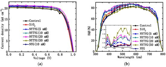 As shown in Figure 9a and Table 2, the VOC of the blank sample is 1.00 V, the JSC is 20.29 mA·cm−2, the FF is 71.69%, and the PCE is 14.51%. The order of JSC and PCE values for PSC devices with different films is as follows: blank sample < NYTYG (50 mM) < NYG (10 mM) < SiO2 < NYTYG (5 mM) < NYTYG (10 mM) < NYTYG (20 mM). The PCE of the device with SiO2 film is 14.88%, which is 2.5% higher than that of the blank sample, and the PCE of the device with NYG/SiO2 film is very close to that of the device with SiO2 film, which is 14.96%. This shows that although the incorporation of nanorods has a certain effect on the structure and thickness of the film, its transmittance does not change significantly (SiO2: 94.3%, NYG/SiO2: 94.1%), so the effect on the PSC photovoltaic performance is small. Through the PCE change of the device with NYTYG/SiO2 film, it can be found that when the NYTYG concentration has little effect on the average transmittance value (5–20 mM), the PCE of the battery device increases with the concentration of NYTYG nanorods, and when the doped concentration of NYTYG nanorods is 20 mM, the PCE of the battery device increases to 15.67%, which is 8.0% higher than that of the blank sample and 5.3% higher than that of the device with SiO2 film. This further proves that the spectral conversion effect of NYTYG nanorods plays a certain role in improving the photovoltaic performance of the device.