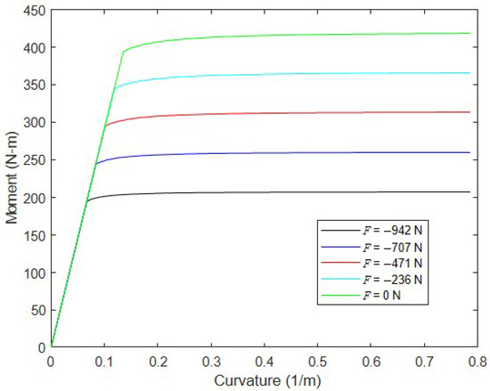 This process is repeated for a range of curvatures to define the complete relationship corresponding to a specific axial load, . The numerical nonlinear moment–curvature analysis overviewed here has been performed for inflated fabric arches with circular cross-sections that carry combined bending and compression [1] and for drop-stitch panels under only bending (i.e., [25], and further details can be found in these references.