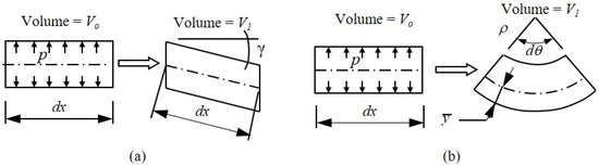 Prior research has shown that incorporating the pressure–volume ( work done by the confined, pressurized internal air has a significant impact on the bending and shear stiffness of the inflated fabric beams and arches [1,15]. Figure 5 illustrates the volume changes caused by an engineering shear strain, , and the bending rotation, , of an inflated panel, where Timoshenko beam theory is used to define the shear deformation.