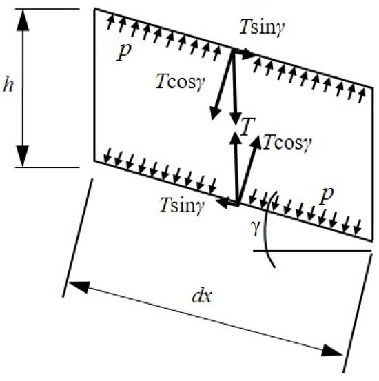 Drop-stitch yarns have also been shown to impact the panel bending response [25], and quantifying their effect requires considering the equilibrium of the panel in its deformed position. Figure 6 shows an elevated view of an infinitesimal length of panel, , subject to an engineering shear strain, , per Timoshenko beam theory, whereby the force, , represents the tension in the drop-stitch yarns that are tributary to the length, , and width, . In the deformed state, the drop-stitch yarns remain vertically oriented while the inflation pressure, , acting on the top and bottom panel skins are perpendicular to the panel skins. The equilibrium then requires that Equation (4) [25] be satisfied.