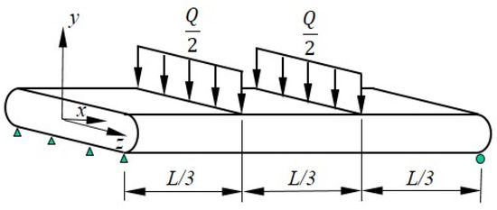 To explore this further, consider a simply supported drop-stitch panel of length subject to a transverse load applied at its third points and distributed evenly across the panel width, as shown in Figure 7. The constant shear strain in the end thirds of the span due to will cause a uniformly distributed moment at approximately the panel’s z-axis, as defined in Equation (5), which effectively increases the panel’s bending.