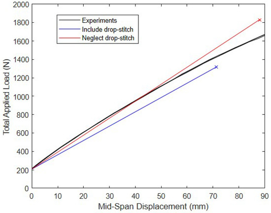 When the additional bending due to the drop-stitch yarn is considered, Equation (7) predicts = 1319 N, which produces a mid-span displacement of 71.4 mm. At the same displacement, the average experimentally measured load is 1427 N, a difference of 8.2%. In contrast, if the additional bending caused by the drop-stitch yarn is neglected, the computed wrinkling load increases to 1830 N at a displacement 88.1 mm. This load of 1830 N exceeds the average experimental load of 1641 N corresponding to 88.1 mm by 11.5%. These results indicate that the inclusion of the additional moment caused by the drop-stitch yarns given in Equation (5) is important for the accurate prediction of the response. The significance of this and other factors in the post-wrinkling range is explored later in this paper.
