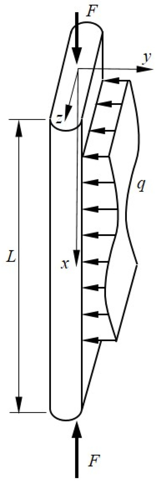 The snow load pressure, (N/m2), was taken as a uniform gravity load acting downward on the horizontal projection of the roof. Gathering the loads, reduces to a single axial compressive load, , since half of the overall width of the structure contributes to . The wall can then be analyzed as a pinned–pinned beam-column subjected to a uniform transverse load, (N/m) and compressive force (N).