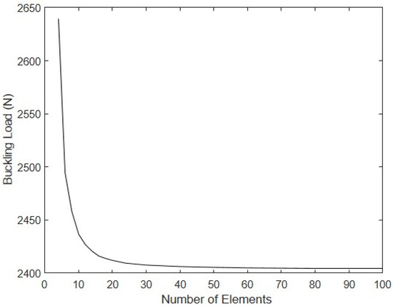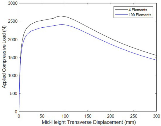 The buckling load vs. the number of equal-length elements used to discretize the drop-stitch column is shown in Figure 10. The results indicate that convergence was rapid and smooth, with the model reaching a value of 2405 N when 60 or more elements were used. To illustrate the buckling and post-buckling response at large deformations, Figure 11 shows the relationship between the mid-height transverse -direction deflection and the magnitude of the applied compressive force for the coarsest mesh with 4 elements and the most refined mesh with 100 elements (the 60-element mesh led to results that were indistinguishable from the 100-element model). While the response is, of course, different for the two meshes, they both exhibited similar responses, as the buckling load approached and in the post-buckling regime. The small amount of stiffening that occurred at deflections of ~80–90 mm can be attributed to wrinkling that occurs after the initiation of significant transverse deflections, which is corroborated by the 100-element model predicting the onset of wrinkling when = 2402 N at a corresponding transverse displacement of 89 mm. On the basis of this convergence study, all further simulations were conducted with the 60-element model.