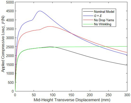 To assess the impact of major contributors to global compressive buckling and post-buckling responses, the previously described FE model was run for cases including , which makes the shear deformations small; drop yarns were excluded; and wrinkling was excluded. The results of these simulations are shown below in Figure 12, along with the results from the nominal model in which all of the response drivers were present. They highlight that shear deformation significantly decreased the panel’s compressive strength: as grew from the experimentally determined value of 33.6 N/mm to 472 N/mm, the panel’s critical load increased by 81% to 4510 N. Further, since shear deformations are small when , the additional moment caused by the drop-stitch yarns, as predicted by Equation (5), was negligible, which increased the buckling resistance of the panel compared to the nominal model. This allowed for the wrinkling and bending pressure–volume work to be mobilized prior to the global buckling at a displacement of approximately 50 mm, and the bending pressure–volume work, in turn, caused an increase in the stiffness prior to the peak load of 4510 N being reached at a displacement of approximately 70 mm. The drop-stitch yarns were also significant drivers of the response: when the effect of these yarns, as captured by Equation (5), was neglected, the panel buckling load increased by 46% relative to the nominal case. However, it is important to note that since the additional moment caused by the drop-stitch yarns was driven by shear deformation, increasing to a large value greatly reduced the negative effect of the drop-stitch yarns on the buckling.