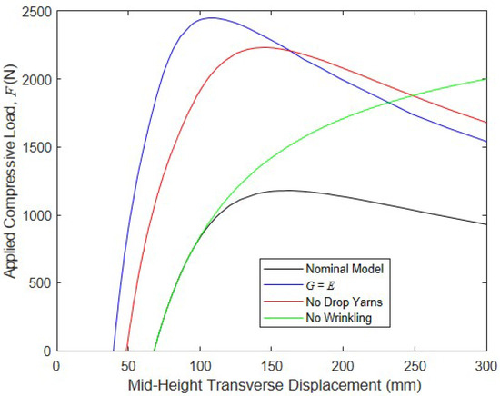 The results of the analysis are shown in Figure 13. The first observation is that the application of load caused both significant initial transverse deflections when 0 that ranged from 40 to 68 mm for the four conditions. Further, comparing the results in Figure 13 with those of Figure 12 shows that the application of a constant dramatically decreased the peak axial loads in all cases. As with the case of pure buckling, using an artificially large value of and ignoring the drop-stitch yarns dramatically increased the peak axial capacity relative to the nominal case, highlighting the importance of considering these effects. In contrast, in the case of pure buckling, however, wrinkling had a much more dramatic effect on the response: the nominal model had a peak axial capacity of 1180 N and exhibited a significant post-peak softening, whereas in the case in which the wrinkling was neglected, the model predicted that the panel would not buckle even at a transverse displacement of 300 mm, where it was still carrying an axial compressive load of 2000 N. Taken as a whole, these results reinforce the importance of considering all facets of the response when considering the combined transverse and compressive loading of drop-stitch panels.