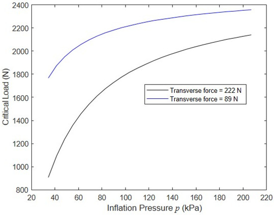 To assess the impact of the inflation pressure, the nominal model was run with two values of a constant transverse load at mid-height, 89 N and 222 N, while the corresponding axial buckling load was determined for inflation pressures ranging from 34.5 kPa to 207 kPa. The larger value of = 222 N was below the wrinkling load of 328 N for the lowest pressure 34.5 kPa. Pressures exceeding the usual upper bound of 103 kPa were considered to provide insight into the response of panels constructed with new techniques that would allow for the use of higher pressures. (As a reference, braided fabric inflatable structural members with circular cross-sections can operate at inflation pressures of 412 kPa or higher [30]). The simulation results shown in Figure 14 clearly show that increasing the inflation pressure significantly increases the panel’s compressive capacity and that the relative increases were greatest for larger values of . This can be attributed to both the fact that increasing delays the onset of wrinkling and that increasing decreases the transverse deflection by increasing the effective shear stiffness.