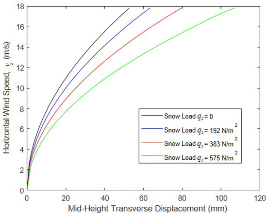 To assess the impact of the different levels of snow load, the model structure was analyzed for wind velocities ranging from 0 to 17.9 m/s and roof snow pressures of 0, 192, 383, and 575 N/m2. In these initial simulations, inflation pressure was fixed at 68.9 kPa and panel depth 102 mm. These values of wind speed and snow load are not extreme but could be expected to be encountered with some regularity across much of the northern portion of the continental United States and in other parts of the world. The average unit weight of new top snow (typically called “powder”) is approximately 1500 N/m3 [32], which implies that the upper snow load of 575 N/m2 corresponds to a depth of 38 cm. However, wet compacted snow can be three or more times denser than this [32], implying a depth of 13 cm or less to produce 575 N/m2. The results of these analyses are given in Figure 15, which clearly show a strong dependence of the wall response on the snow load. However, the maximum mid-height transverse displacement of the drop-stitch wall is 107 mm for the largest value of , and no sign of instability is evident in this figure.