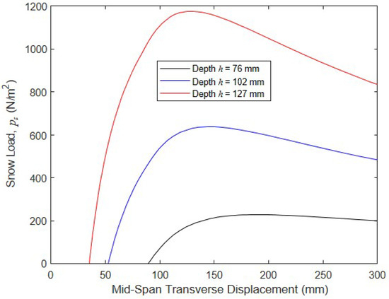 A critical design parameter for the wall was the panel depth, : as increased, the panel bending stiffness increased dramatically; the pressure resultant and, thus, the effective shear rigidity increased; and the onset of the wrinkling and subsequent softening occurred at higher loads. To assess the impact of the wall depth and its impact on the ultimate wall capacity, a series of analyses were run where walls with 76, 102, and 127 mm were modeled while the wind speed, , was fixed at 17.9 m/s, was increased until the wall collapsed, and the post-buckling response was tracked to transverse deformations of 300 mm. The results of these analyses are shown in Figure 16. The original wall with a depth of 102 mm carried a peak of 639 N/m2 at a corresponding transverse displacement of 144 mm, which is only 11% greater than the maximum value of of 575 N/m2 considered in the first set of analyses. Put another way, a 102 mm thick wall only has a factor of safety of 1.11 against collapse when subjected to a 17.9 m/s wind while carrying a snow load of 575 N/m2. However, increasing the panel depth by only 25 mm to 127 mm while keeping all other properties constant increased the maximum snow load capacity to 1176 N/m2, providing a very reasonable factor of safety against collapse of 2.05. Conversely, decreasing the wall depth to 76 mm reduced the wall snow load collapse pressure to 229 N/m2. These results clearly highlight the importance of the wall panel depth for this practical structural configuration.