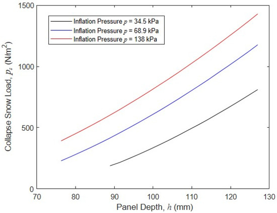 Another important design parameter is inflation pressure. To examine the significance of and its interaction with , a series of simulations were run where the effect of panel depth on the collapse snow load was quantified for different values of 34.5 kPa, 68.9 kPa, and 138 kPa. In each simulation, the panel was subjected to a constant wind velocity of 17.9 m/s, and increasing snow load pressures were applied until the panel collapse load was reached. This process was repeated for panel depths ranging from 76 mm to 127 mm. The results of these simulations are shown in Figure 17, and indicate that increasing in conjunction with can markedly increase the panel collapse load. For example, for an intermediate panel depth of 102 mm, increasing from 68.9 kPa to 138 kPa increased the collapse snow load pressure from 640 N/m2 to 847 N/m2, a change of 32%. In contrast, reducing to 34.5 kPa results in a drop in the collapse snow load of 44% to 357 N. These simulations clearly show that both inflation pressure and panel height are important drivers of panel capacity and that their impacts are coupled.