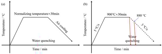 Five plates with dimensions of 24 mm × 300 mm × 350 mm were cut from the rolled steel. The five plates were heated in a chamber resistance (YIANJIE ELECTRIC FURNACE INDUSTRY Co., Ltd., Luo Yang, China) for 30 min at temperatures of 850 °C, 875 °C, 900 °C, 925 °C, and 950 °C, respectively. The plates were then taken out and allowed to cool back to room temperature. A graphical figure depicting the specific process of normalizing heat treatment is provided in Figure 1a. Primitive austenitic grains of the samples at different normalizing temperatures, as well as phase transition, are observed to record changes in precipitation. The following thermal process is simulated on the Gleeble 3800 thermal simulator (Dynamic Systems Inc., New York, NY, USA). One pair of samples was heated to 900 °C at a speed of 5 °C/s, holding at 900 °C for 30 min. Then, the sample was quenched with water to 20 °C immediately. The other pair of samples was heated to 900 °C at a speed of 5 °C/s, holding at 900 °C for 30 min. Then, the sample was quenched with water to 20 °C as the sample cooled to 880 °C along the dotted line (Figure 1b).
