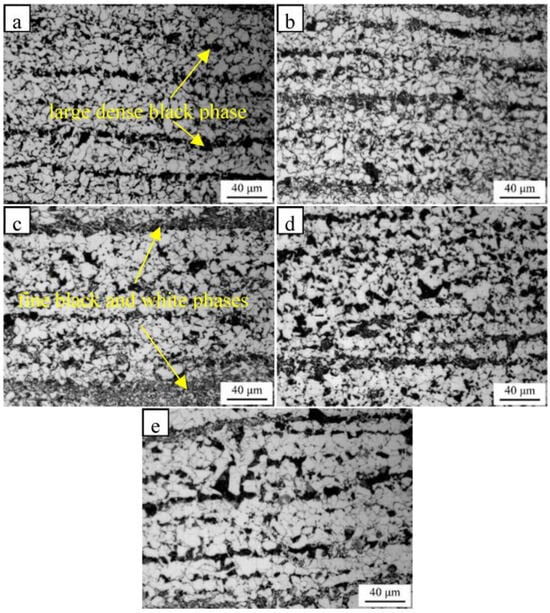 Microstructures of the samples normalized at different temperatures of (a) 850 °C, (b) 875 °C, (c) 900 °C, (d) 925 °C, and (e) 950 °C.