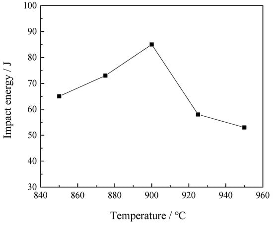 Impact results for samples under −40 °C and normalized at different temperatures are summarized in Table 2 and Figure 6. The impact energies of samples normalized at temperatures of 850 °C, 875 °C, 900 °C, 925 °C, and 950 °C were found to be 65 J, 73 J, 85 J, 58 J, and 53 J, respectively. The impact energy of the steel samples initially increased almost linearly with an increase in normalizing temperature, achieving its maximum value at a temperature of 900 °C, after which it started to decrease.