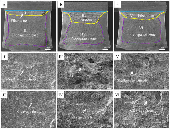 The fracture characteristics of the impact samples at different normalizing temperatures are shown in the SEM images presented in Figure 7. The impact fracture characteristics of the samples normalized at temperatures of 850 °C, 900 °C, and 950 °C are provided in Figure 7a, Figure 7b, and Figure 7c, respectively. Also, the area of the fracture fiber zone was computed using the Image-pro software. The fracture fiber rates for samples heated at normalizing temperatures of 850 °C, 900 °C, and 950 °C were obtained as 7%, 26%, and 15%, respectively. The fracture fiber of the impact samples increased initially and then decreased as the normalizing temperature was increased. The morphologies of the fracture fiber and the propagation zones shown in Figure 7a are depicted in Figure 7Ⅰ,Ⅱ, respectively. The fiber zone of the impact fracture at 850 °C was characterized by small and shallow dimples, while the propagation zone mainly consisted of large and flat cleavage planes. Similarly, the morphologies of the fracture fiber and the propagation zones in Figure 7b are shown in Figure 7Ⅲ,Ⅳ, respectively. The fiber zone of the impact fracture at 950 °C was also characterized by small and shallow dimples, whereas the propagation zone was mainly composed of cleavage planes. The morphologies of the fracture fiber and the propagation zones in Figure 7c are shown in Figure 7Ⅴ,Ⅵ, respectively. The fiber zone of the impact fracture for the sample heated at a normalizing temperature of 900 °C was characterized by small and deep dimples as well, while the propagation zone consisted of small cleavage planes. However, compared with the cleavage planes observed for the samples prepared at normalizing temperatures of 850 °C and 950 °C, the cleavage planes for the 900 °C sample were observed to be more “uneven”, and a tearing ridge with a few dimples was also found in between some of the cleavage planes.