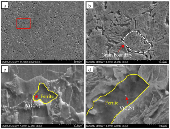 SEM images of sample quenched at 880 °C (a), enlarged in the red box in Figure 11a (b), intracrystalline ferrite nucleates on V(C,N) particle (c), and nucleation of grain boundary ferrite on V(C,N) particle (d).