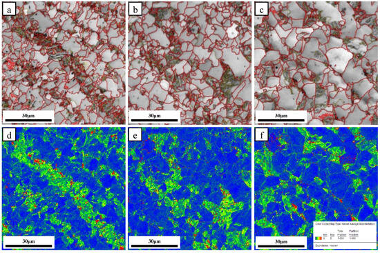 IPF and IQ images for the microstructures of steel samples normalized at different temperatures of (a,d) 850 °C, (b,e) 900 °C, and (c,f) 950 °C, (a–c) IPF, (d–f) IQ.