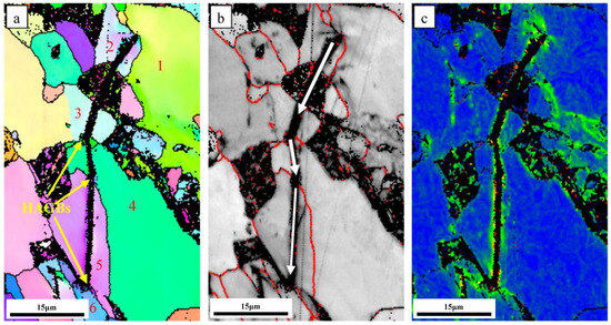 The microstructure and spatial distribution of HAGBs play a significant role in hindering crack propagation [13,31]. The obtained EBSD images showing secondary cracks in the sample prepared at the normalizing temperature of 900 °C are provided in Figure 14, where the red line represents the high-angle grain boundaries (HAGBs) defined by an angle of 15°. The absence of deflection as the crack passes through the interior of the grains indicates that there is little obstruction to crack propagation inside the grains. Nevertheless, the direction of the crack propagation changed and was finally captured at HAGBs. The above results show that high-angle boundaries (θ > 15°) can act as effective barriers to impede crack propagation. In the case of the 900 °C sample, the ferrite grains were finer, the HAGBs were more closely spaced, and the cracks were deflected several times during the crack propagation. This can clearly be observed in Figure 14b (the white arrow represents the direction of crack propagation).