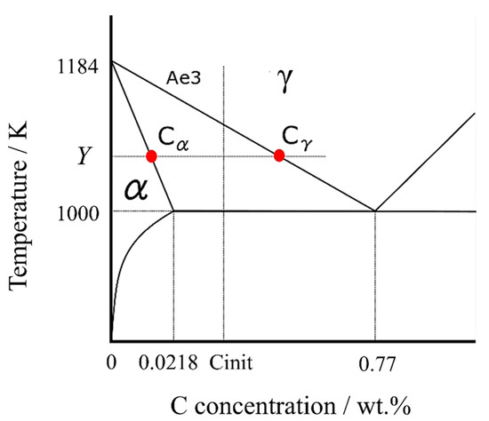 In the initial γ structure, the carbon concentration was assumed to be uniformly distributed in each cell. As depicted in the phase diagram of carbon steel in Figure 1, the α phase has a lower concentration of solid solute carbon than the γ phase. Consequently, when α nucleation takes place, the excess carbon that cannot be dissolved into the solid solution is expelled, increasing the local carbon concentration in the vicinity. This alteration in carbon concentration sets up a concentration gradient, driving carbon diffusion.
