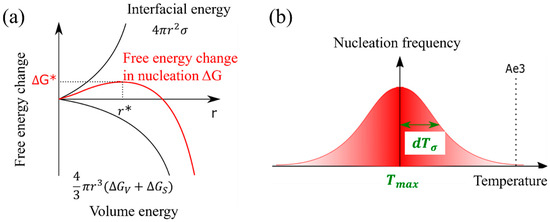 The α nucleation frequency, as described in Equation (10), exhibits a Gaussian distribution pattern that is temperature dependent. In this equation, represents the temperature at which the probability of nucleation is maximized, and denotes the standard deviation [35]. Furthermore, the assumption that the α nucleation frequency follows a Gaussian function is justified by the resemblance of the change in nucleation-free energy, as depicted by the solid red line in Figure 2b, to a Gaussian function.
