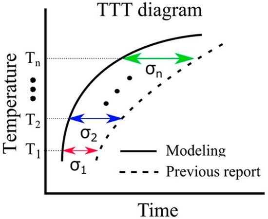 Thermal transformation diagrams, known as time–temperature–transformation (TTT) diagrams and continuous cooling transformation (CCT) diagrams, serve as crucial tools for comprehending phase transformation properties [56]. The ability to predict these TTT and CCT diagrams holds the potential for substantial advancements in steel development. While Enomoto et al. successfully made such predictions, underscoring the need for further insights into the α-phase transformation, which remains a significant research challenge [57]. In this model, the function in Equation (19) represents the error between the simulation results and the literature values pertaining to the TTT diagram. The evaluation function serves the purpose of assessing this error. In Figure 3, it is important to note that and correspond to the value on the horizontal axis of the TTT diagram at time . Due to the unique attributes of each evaluation function, the root mean squared logarithmic error (RMSLE) was employed. The evaluation function was computed based on results obtained at four different temperatures: 900, 950, 1000, and 1050 K. Additionally, the RMSLE formula in Equation (30) utilizes to prevent situations where the evaluation function becomes incalculable due to being undefined. indicates the reference value at time . However, it is crucial to mention that in our model, the phase transformation does not solely commence at the initial nucleation corresponding to 0 s. Thus, the logarithm function remains within its defined range. Therefore, as an evaluation function that is more intuitive than RMSLE, we introduced the evaluation function expressed in Equation (31). We obtained results using both RMSLE and and it is evaluated which one is more suitable. As indicated by the equations, it can be concluded that the closer the values of RMLSE and RMSEV are to 0, the more closely the literature values align with the model results.