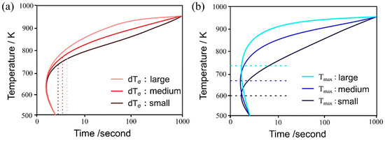 Figure 4a,b illustrate the influence of both and on the TTT diagram, respectively. As the parameter decreases, noticeable changes occurred in the curvature around the nose of the TTT diagram, both at the initiation and completion of the transformation, resulting in a more distinct nose feature. This phenomenon arises from the reduction in standard deviation, which, in turn, leads to an increased difference between the temperature at which the nucleation frequency reaches its maximum and the holding temperature. This differential temperature alteration significantly impacts the nucleation frequency.