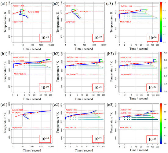 TTT diagrams obtained from different values of the incubation period constant in (a1–a3) Fe−0.20 wt.%C, (b1–b3) Fe−0.35 wt.%C, (c1–c3) Fe−0.50 wt.%C. The incubation period constants are shown in the inserted red frames at the lower right in each diagram.