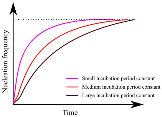 Furthermore, it is essential to consider a time delay before nucleation attains a stable state, a phenomenon commonly referred to as the incubation period of nucleation [5,43]. In this study, this incubation period was incorporated into the analysis using Equations (11) and (12). In Equation (10), the nucleation frequency was replaced by , representing the steady-state nucleation frequency.