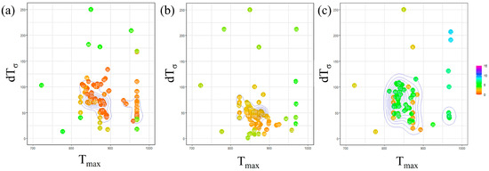 Figure 7 presents the outcomes of Bayesian optimization involving two parameters, and , with the incubation period constant determined for each carbon concentration. In this figure, the parameters investigated in each Bayesian loop are represented on a two-dimensional plot with on the horizontal axis and on the vertical axis. The RMSLE value corresponding to each parameter combination is depicted using a color bar. Additionally, contour lines are included to indicate the density of the parameter search. Based on this representation, we identify the parameter values associated with a lower RMSLE and those exhibiting clustered contour lines as the optimal choice.
