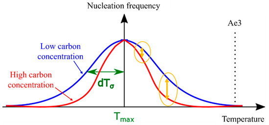 As temperature increases, it is evident that the driving force for nucleation becomes more reliant on carbon concentration. This relationship is translated into Figure 9 when applied to Equation (10). With decreasing as carbon concentration increases, the nucleation frequency exhibits minimal dependence on carbon concentration in the low-temperature range. However, the model can accurately reproduce changes that demonstrate a strong dependency on carbon concentration in the high-temperature range. Consequently, in models that do not account for the nucleation incubation period, the value of tends to decrease as carbon concentration increases.