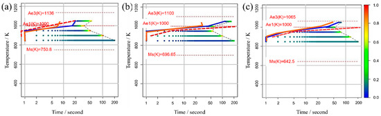 Conversely, the parameter has a notable influence on the TTT diagram. As its value decreases, the nose position in the TTT diagram fluctuates at both the onset and conclusion of the transformation. This occurs because the initiation of the transformation involves carbon diffusion, and the diffusion rate is temperature-dependent, as evidenced by Equation (14). Therefore, the extent of change in does not necessarily correspond directly to the change in the nose position [58].