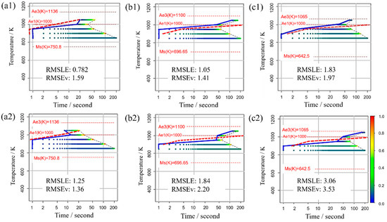 TTT diagram obtained using RMSLE and RMSEV as the evaluation functions in Bayesian optimization in (a1,a2) Fe-0.20 wt.%C, (b1,b2) Fe-0.35 wt.%C, (c1,c2) Fe-0.50 wt.%C. The blue solid line represents the simulation result. The red dashed line represents the previous results [44].