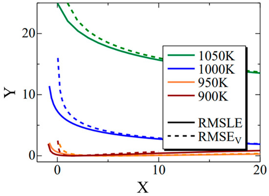 The Σ interior function in the RMSLE and RMSEV equations. The black solid and dashed lines indicate the RMSLE and RMSLEV, respectively. The green, blue, orange, and brown lines indicate the temperature of 1050 K, 1000 K, 950 K and 900 K, respectively.
