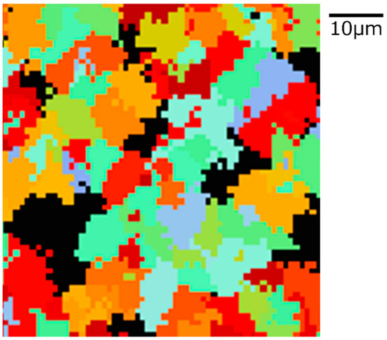 The state of α phase transformation is monitored at each calculation step using the optimal parameter values specific to each carbon concentration. The virtual initial γ structures employed in these calculations encompass three distinct types with varying initial γ grain sizes, as illustrated in Figure 13. It is important to note that the black regions represent the boundaries of the γ grains. Figure 14 displays the microstructural outcomes of Fe-0.20 wt.%C after holding at 950 K, maintaining the same microstructure as a previous experiment result [60]. The crystal orientation of α grains is depicted using color bars, where colored regions signify α grains, while white regions represent γ grains. It is worth mentioning that in the earlier research, black grains corresponded to γ, and white grains represented α. These results show that realistic shapes and scales of α grains have been accurately predicted for all carbon concentrations, demonstrating favorable alignment with previous studies.