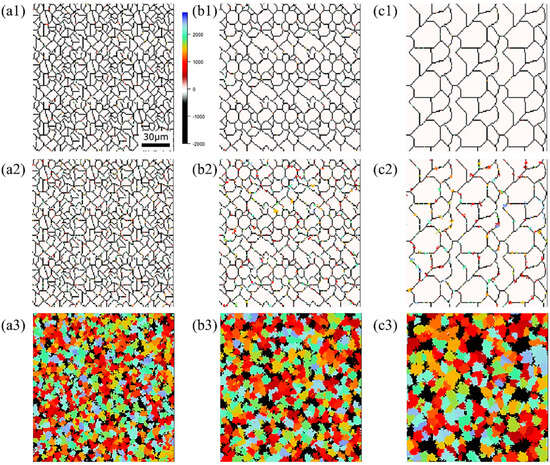 Initial microstructure virtuality with different average γ grain sizes: (a) 5.01 μm, (b) 8.13 μm, (c) 15.00 μm.