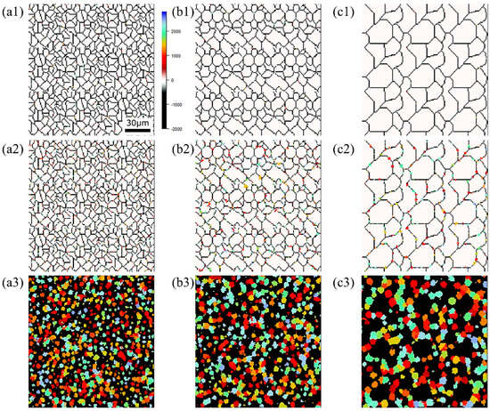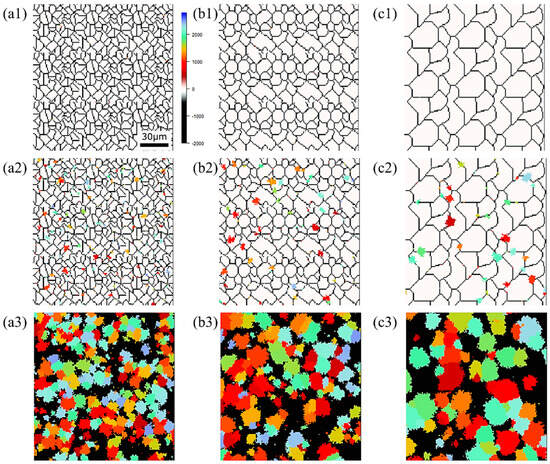 Microstructure during α transformation in Fe−0.35 wt.%C with initial different average γ grain sizes (a) 5.01 μm, (b) 8.13 μm, (c) 15.00 μm after annealing at 1000 K (a1,b1,c1) at the beginning of annealing process, (a2,b2,c2) at the beginning of phase transformation with the volume fraction of α phase 3%, (a3,b3,c3) after completion of phase transformation.