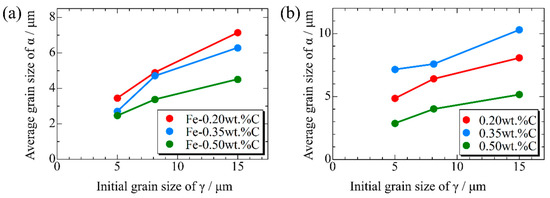 Relationship between initial γ grain size and average grain size of α after phase transformation in the samples with different carbon concentrations after annealing at (a) 950 K and (b) 1000 K.