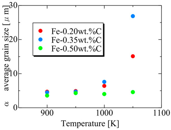 Considering the relationship between carbon concentration and the driving force for nucleation, it is evident that the lower the carbon concentration, the smaller the driving force for nucleation. Conversely, when considering the equilibrium volume fraction, the lower the carbon concentration added, the larger the α volume fraction observed. In the case of Fe-0.20 wt.%C, a substantial number of α grains of a specific size precipitate. However, in Fe-0.50 wt.%C, the driving force for nucleation is small, and the equilibrium α volume fraction is also low, resulting in fewer precipitated α grains and smaller grain sizes. Meanwhile, in Fe-0.35 wt.%C, although the driving force for nucleation decreases compared to Fe-0.20 wt.%C, the equilibrium α volume fraction remains substantial, allowing the α grains to grow sufficiently. Consequently, we can affirm that the relationship between carbon concentration and the average α grain size upon completion of the α phase transformation has been elucidated in Figure 19. In the temperature range below 950 K, the average α particle size decreases as the carbon content increases, consistent with previous findings. However, in the temperature range of 1000 K or higher, when comparing the results for 0.20 and 0.5 wt%C, a similar trend was observed. However, the carbon content in this case led to a structure that partially contradicted this trend.