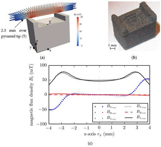 (a) Developed shape of a parallelepiped magnet with a pyramidal recess; (b) FDM-printed isotropic magnet with filament containing spherical NdFeB particles in a PA11 matrix; (c) simulation and experimental data comparison for Bx, By, and Bz components along x axis of the magnet [41].