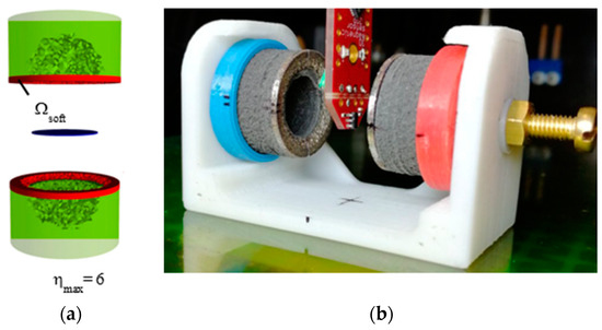 The inverse problem was solved with a continuum approach that does not take into account particle sizes in a real magnet but takes into account the magnetic composite density distribution generating a correspondent magnetic flux field. Using this method, it is possible not only to simulate the stray fields of a magnet with a known shape but also to design new magnets with a given distribution of stray fields. In [48], a magnet in the form of a hollow cylinder with an optimal magnetization distribution was designed and manufactured (Figure 5).